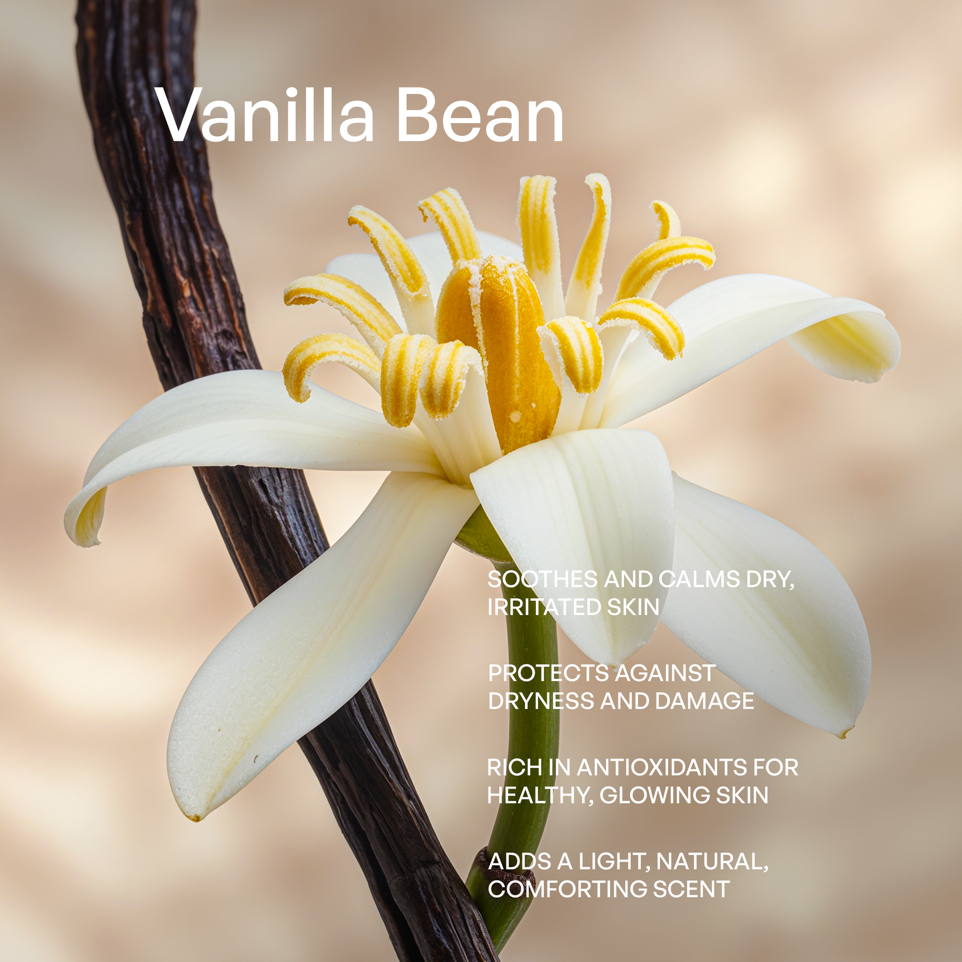Vanilla Bean – The aromatic seed pods of the vanilla orchid (Vanilla planifolia), known for their soothing and antioxidant properties, enhance skincare products with a pleasant fragrance and skin benefits.